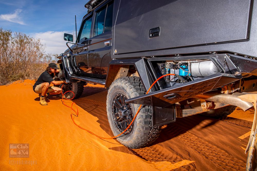 As a general rule, if your vehicle is struggling a bit in the sand, reducing your tyre pressures by 2 PSI can make a significant difference. For instance, if you're running at 20 PSI and you release 2 PSI from your tyres, that's a reduction of 10 percent, and you should notice an improvement. If necessary, continue to decrease pressure by another 2 PSI.
