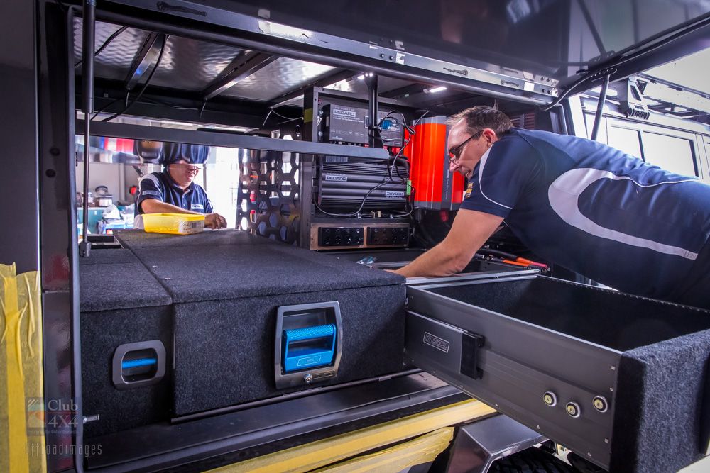 Shane Miles created a set of drawers which really set the service body off. The custom drawers were a simple fit for the team at MSA as the floor of the Trigpoint canopy is perfectly flat with no ridges. This looked amazing. While it was at Shane’s factory, we had the stereo and speakers installed. It made sense to achieve installation of gear by a mobile stereo company in the front while all this work was being carried out in the service body. My tip is to make the most of all the time available when on a tight schedule. There are so many parts that need to find their place.