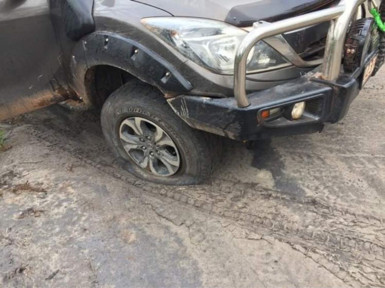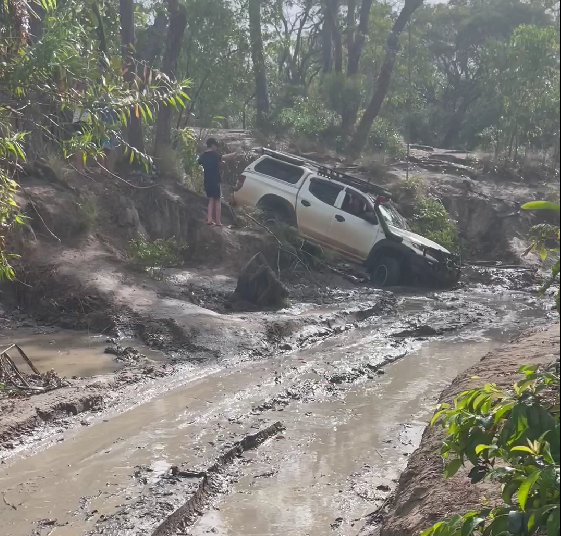 Chris and Shelley’s Hilux got a bit off line coming down and around the bend in the slippery mud and had to be pulled out, but the rest of the crew just powered through.