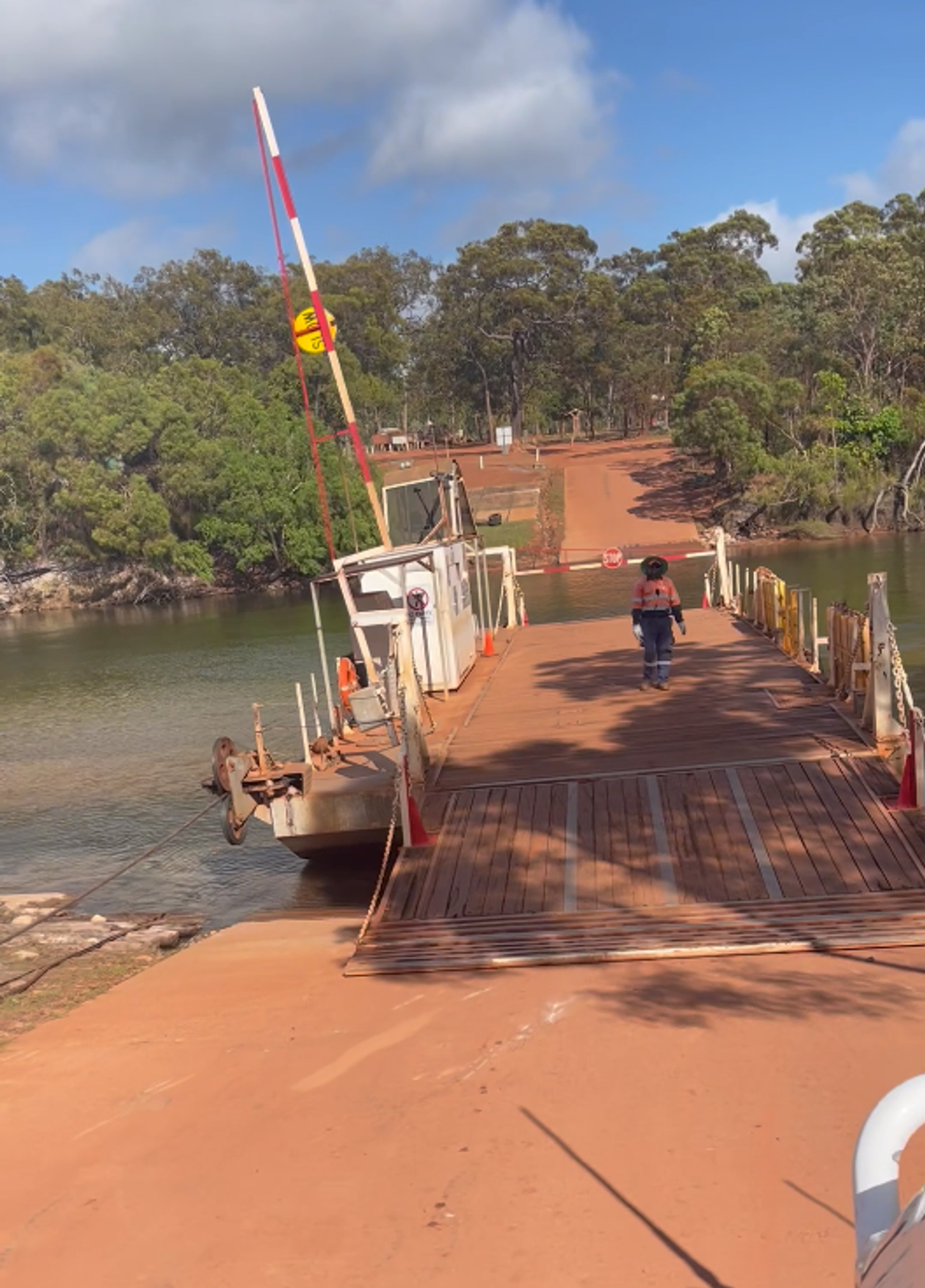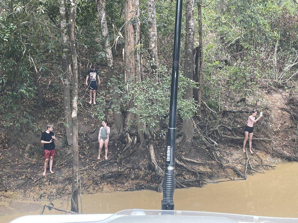 In the past, the Jardine River was drivable further upstream where the Tele Track meets the river, but with a strong current and depths reaching as high as 4 meters, everyone now uses the ferry to cross. The ferry crossing is a short ride down a steep ramp, across the river and back up the other side. The traditional owners had the kids looking out for an 8ft crocodile that lives nearby.