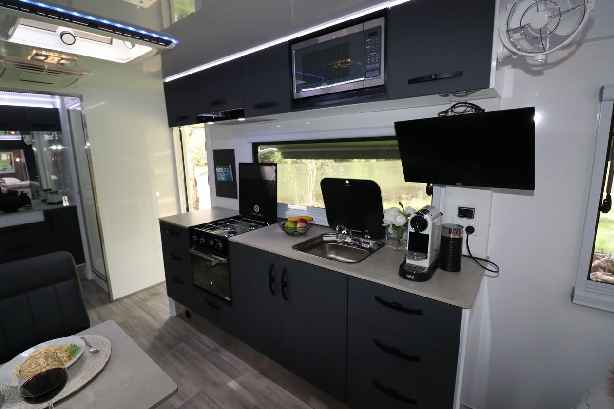 Any chef would love the kitchen. It has plenty of storage. It comes equipped with a four-burner gas stove, grill and oven as well as a microwave that can run off the massive 3000-watt inverter. Ours even had a coffee maker as a cost-option. Opposite the kitchen is the 208-litre refrigerator and a convenient full-height slide-out pantry for food and drinks.