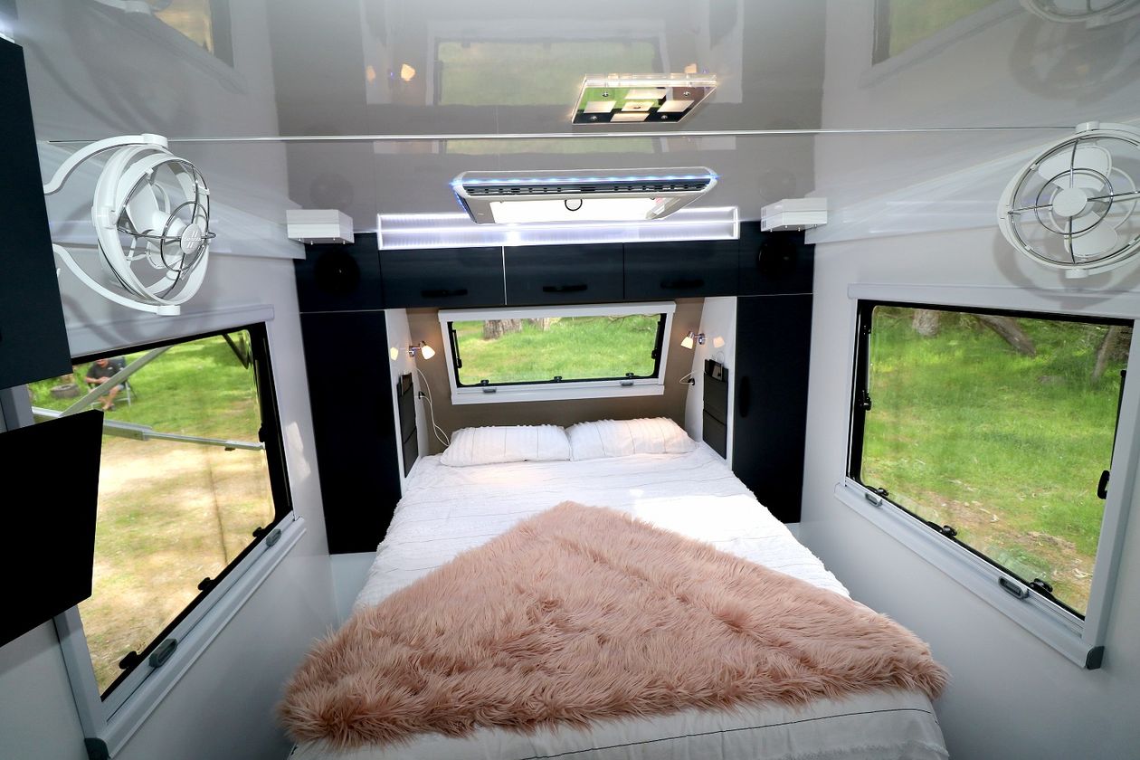 Step inside, and you will find a chic apartment that oozes luxurious appeal with touch control and smart technology. Thereâs plenty of storage space with loads of soft-close cabinetry overhead, to the side and under the tilting bed base. Handy pockets either side of the bed and a choice of five different mood settings, as well as two 12V fans, make the bedroom an inviting and comfortable space.