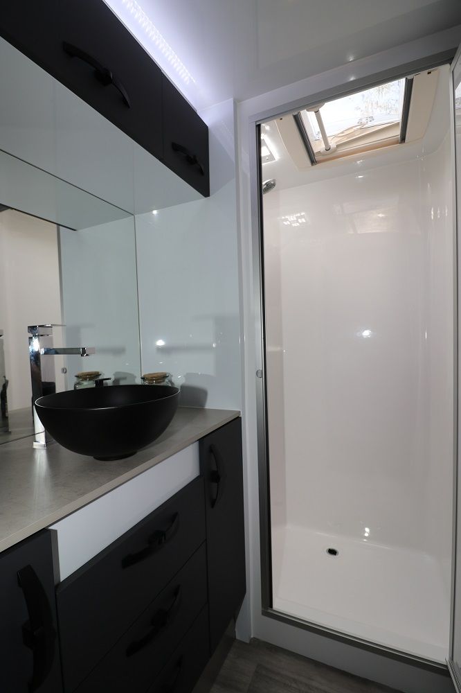 One of the secrets to the lightweight strength of the LXV is not just its fully insulated composite frame with aluminium internal cabinetry which helps provide rigidity. The floor, roof and wall panels are all CNC Router cut European XPS composite fibreglass with perfect gloss white finishes both inside and out. There are a range of double-glazed Euro-style windows with four roof-mounted skylights, front and rear mud flaps, two chassis-mounted recovery points, heavy-duty stabilisers, ARK jockey wheel, dual rear hitch mount receiver for toys and accessories, and an integrated stone guard and vented storage compartment at the front with a rubberised finish for stone protection. This large lockable toolbox has two 20-litre jerry can holders and a 9kg gas bottle holder plus room for accessories, recovery gear and tools.