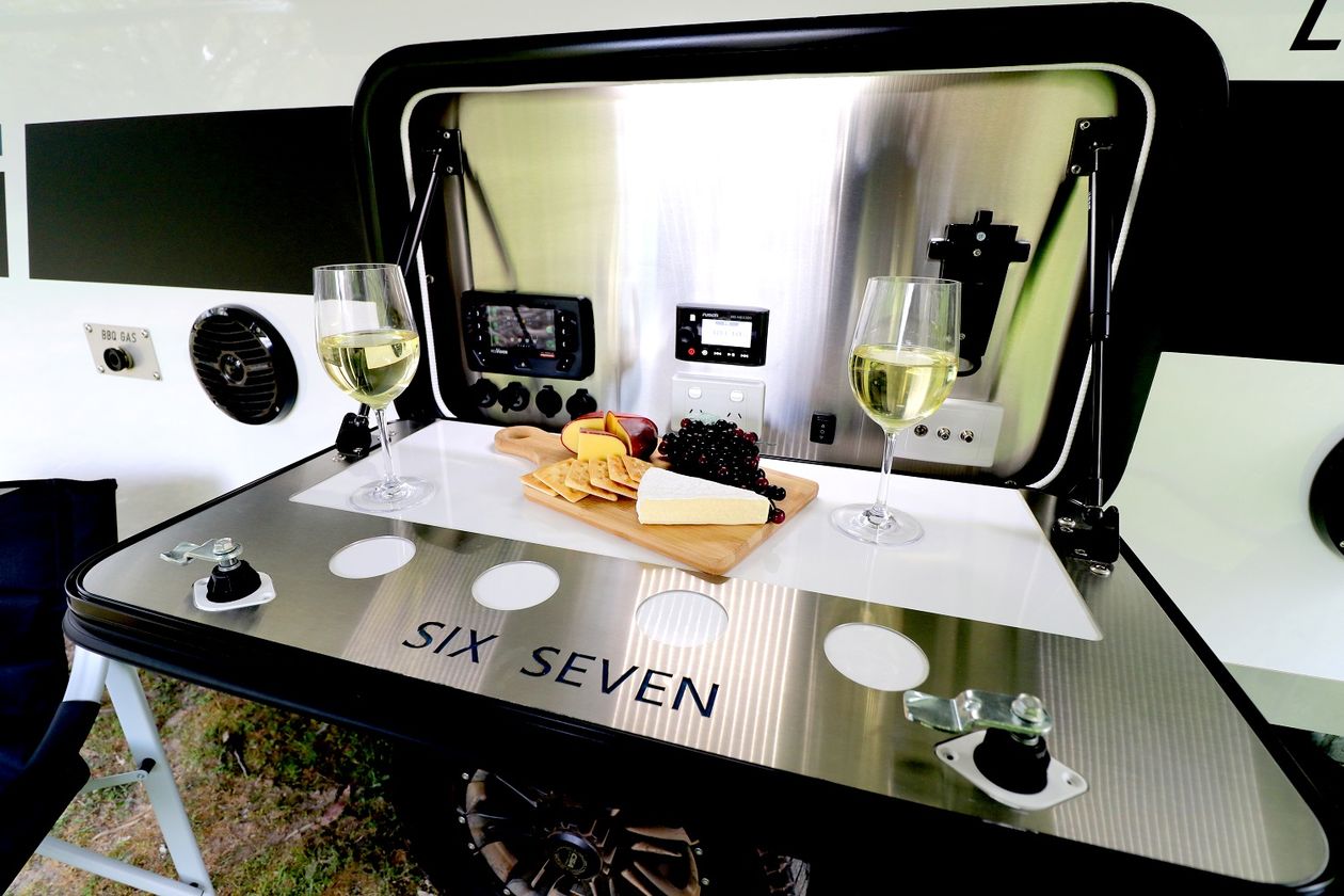 I loved the full-length electric awning. Combine this with the ease of the airbag levelling and an electric fold-out stairwell, and youâll have easy camping in a jiffy. Up in front is a vast carpet-lined and dust pressurised storage compartment. On the side are a fold-down drink and food bar with an entertainment cabinet behind, complete with 12- and 240-volt power outlets, external aerial sockets for the TV plus remotes for the Fusion Bluetooth sound system for a thumping rock box with external and internal speakers.