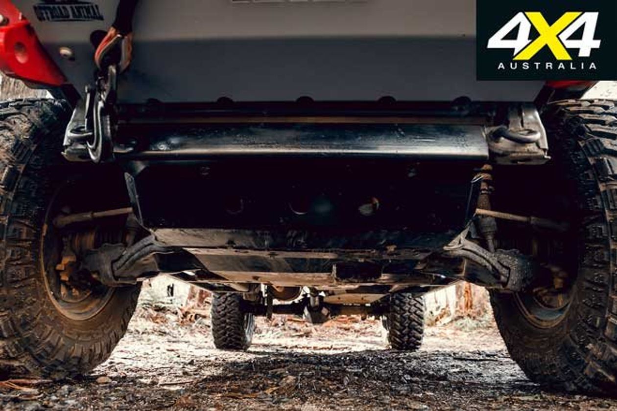 Moving underneath and it becomes all too obvious this Hilux is built for serious off-road work. Starting from the front, 5mm-thick steel plates have been built from scratch by the guys at Phat Bars in Queensland’s south-east. They protect the engine’s sump, transmission and transfer case from wayward rocks and trip-ending tree stumps.