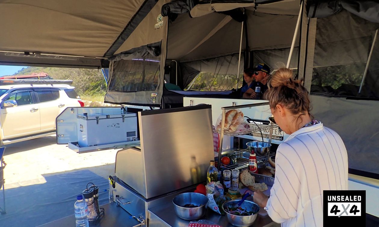 As is standard on a forward fold, the side wall that opens onto the kitchen rolls up, transforming the interior of the camper to an indoor/outdoor space that creates a wonderfully social atmosphere between those who are slaving over a hot stove and those who are bludging over a game of Uno. It also means you can kick it with a magazine and a beer in the interior lounge without feeling like you’re shut away inside. This is camping, after all.