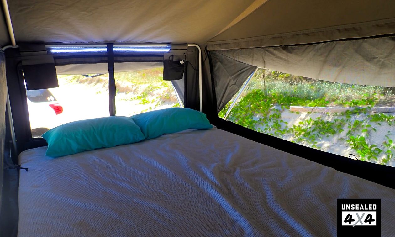 But, you know, it’s good to have the option, which you do with the Lachlan; it comes with a fully enclosed annexe including walls, floor and two-room ensuite, with gas hot water service and portable toilet included. It’s top notch stuff, too, with Bluewater Campers using quality Australian-made canvas, heavy-duty YKK zippers and Finetex mesh on the windows that kept the sandflies at bay when we set it up on the beautiful Noosa Foreshore.