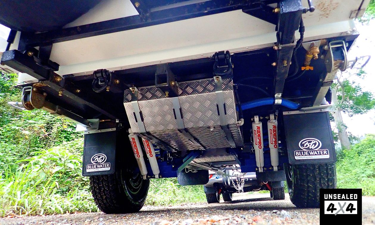 That hot stove I speak of is a three-burner Dometic, plumbed internally to where the gas bottles are housed in the storage hatch on the drawbar. This sits on a stainless steel slide-out kitchen with a large sink and water plumbed via a SeaFlo 42 Series pump with quality John Guest fittings and waterlines, all fitted at Bluewater’s Melbourne factory. There’s 160 litres of fresh water storage across two stainless steel tanks on the underside of the camper trailer. These can be isolated from one another to avoid cross-contamination if your water source is less than delicious during remote travel, or bypassed altogether when there’s mains water available while camping in caravan parks.