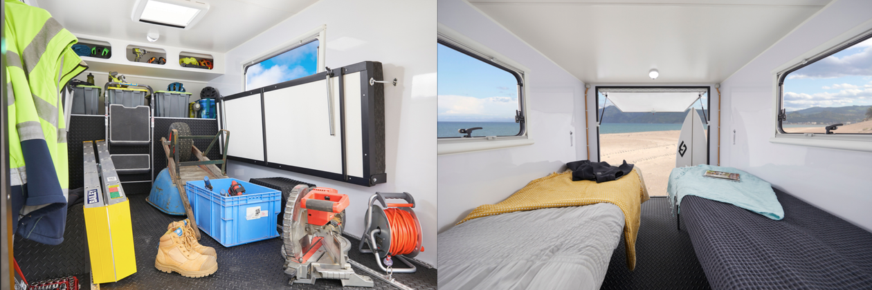 It sleeps up to two people with two-fold down single beds. Space is maximised with removable storage tubs and includes a 100 amp battery, large front toolbox and tie-down points for bikes, surfboards and all your work tools, so you have all the space you need to hold all your equipment and favourite outdoor gear including motorbikes, mountain bikes and quad bikes under one roof.