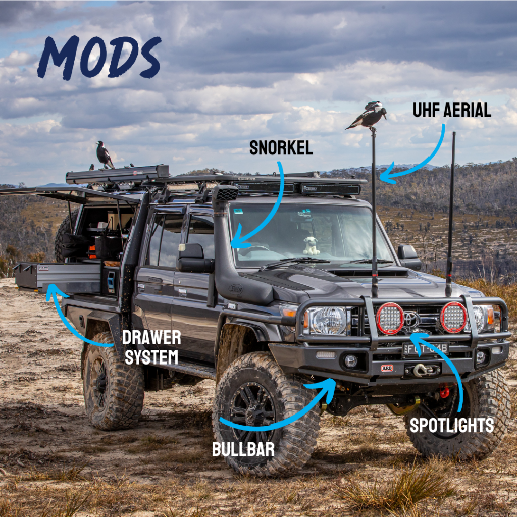 Modifications or ‘mods’ and accessories are aftermarket items that are permanently fixed to your vehicle i.e., bolted or welded to the vehicle.