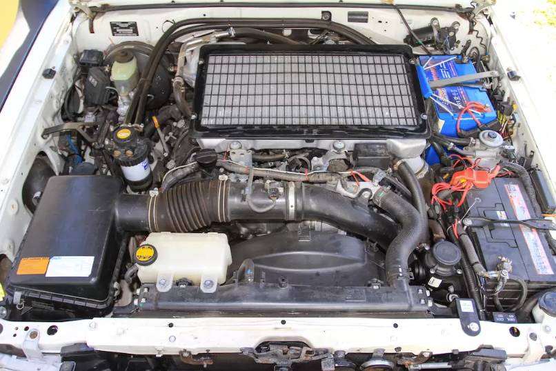 You’ll see the aftermarket pre-filter on the left side of the engine bay, with lines that run over to the factory filter on the right, via the firewall.