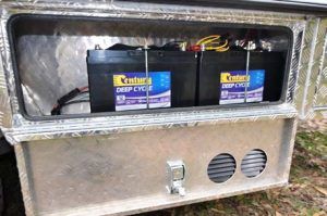 Overall, it has a nice feel and I layout for a travelling couple, plus you can be assured of a good night’s sleep after a long day on the road with a bed that stays permanently assembled for even greater ease. Under the bed is a large storage area that also houses the Projecta 25-amp charger/BMS, Finch heater/air conditioner plus a pull-out cabinet for a portaloo. Bushranger offers a Finch 240V air-conditioner/heater option that really came in handy when we suffered 45°C Broken Hill desert heat. If you don’t want to sleep with your trail mate, they also offer a twin bed version.