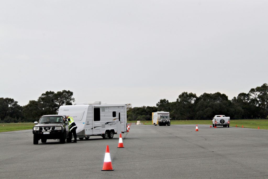 Next it was time to jump in and give it all a go. We were going to tow the caravans through a slalom circuit; then do some emergency stops, in the dry and the wet; and finally the dreaded reversing – in a straight line, around a corner and into an allocated bay just like in a caravan park (although without all the trees, kids and people watching).
