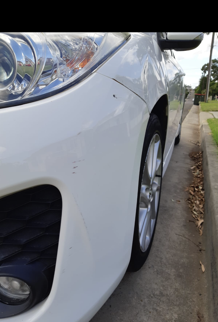 Late last year, my elderly (hope she doesn’t read this!! – sorry Ma) mother had a small and unfortunately incident with a pylon in her favourite shopping centre. Most importantly, she’s fine and the car is still safe and driveable, but looking a little less perfect than I’d like. The victim in this case is a 2011 Mazda 3 – damage: driver side guard and bumper. Being a 3 layer pearlescent white, it’s likely to need blending across a number of panels to ensure an appropriate colour match.