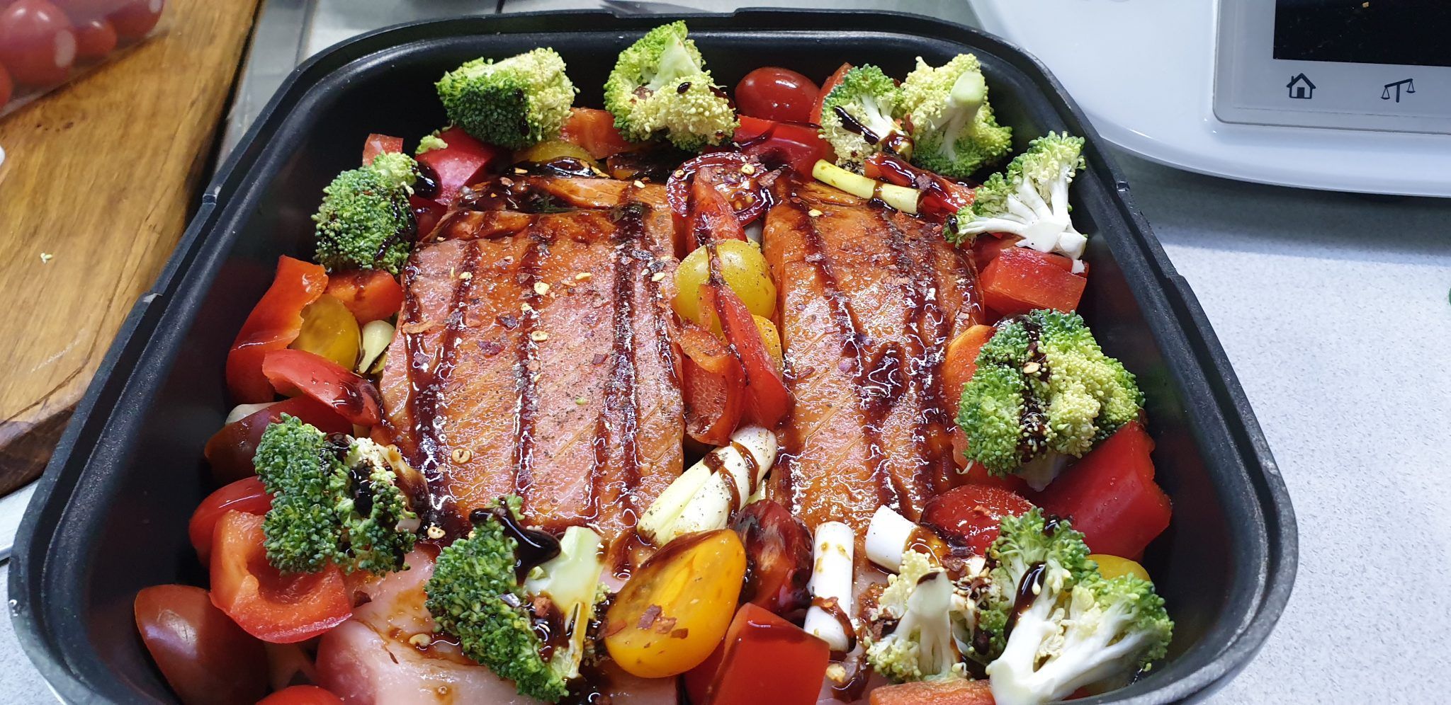 2 x Salmon fillets either skin on or off1 x 320g Punnett of Perfection Mix-A-Mato Tomatoes halved2 x Cups roughly chopped spring onions2 x Cups roughly chopped green vegetable. Either broccoli, broccolini or asparagus.1/2 Red or yellow capsicum roughly chopped1 x Cup of thinly sliced red cabbageCoconut oilSoy sauceBottle of balsamic glazeChilli flakesSalt and ground pepper