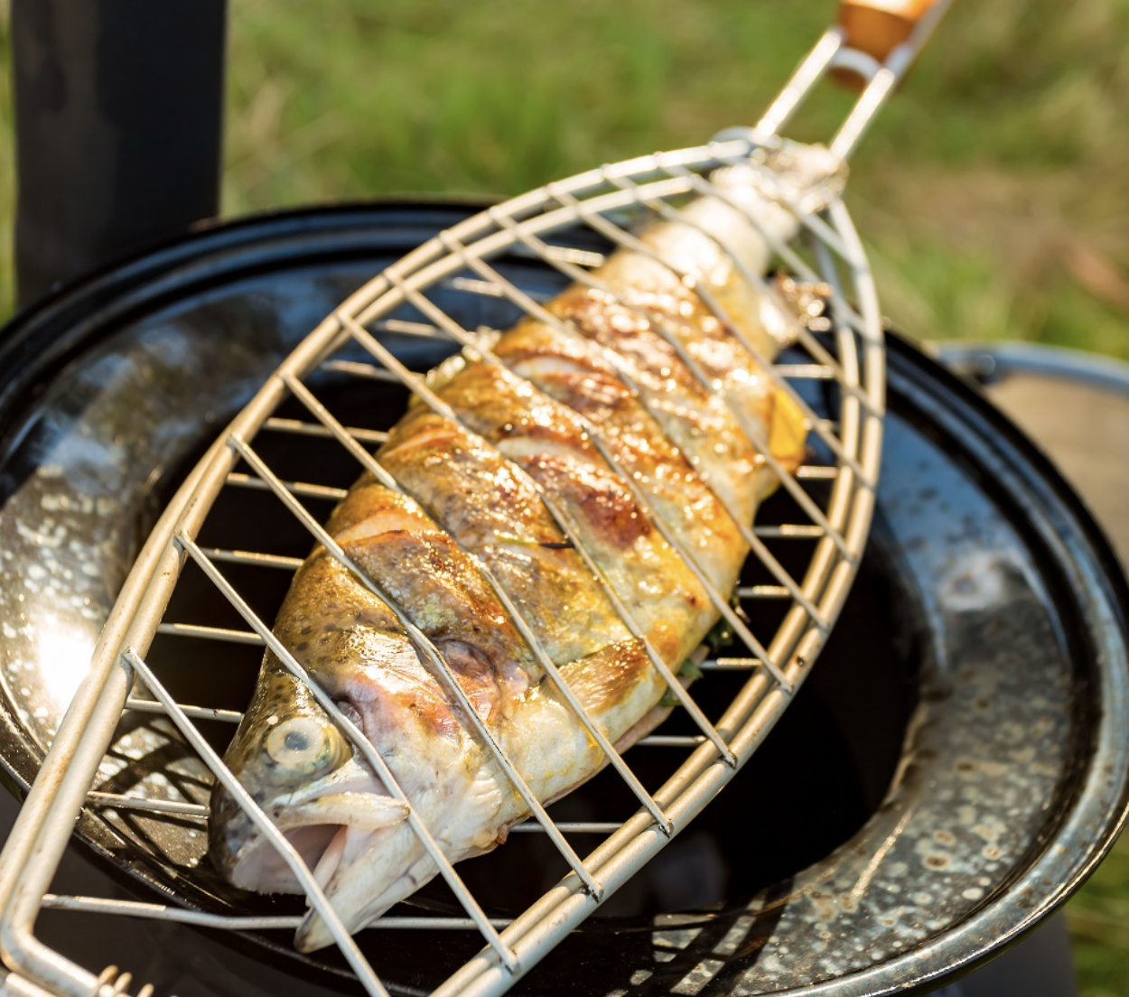 Step 1 Fill the cavity of the fish with the coriander, ginger, lemon and chill. Step 2 Combine the basting ingredients. Baste the outside of the fish with the basting marinade. Step 3 Place the fish into a fish press/sandwich grill and place into the smouldering coals of the Ozpig. Cook for around 6-8 minutes on each side basting one more time before service.