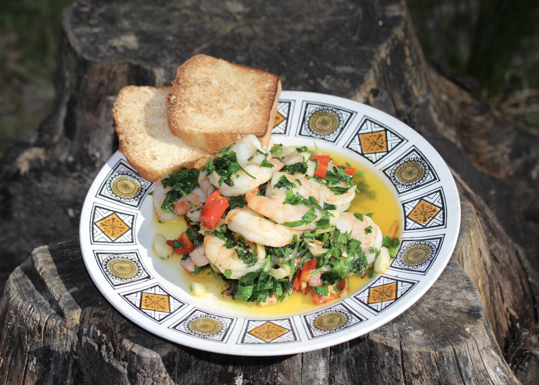 500g De-veined king prawns 1 x Cup of diced bacon 3 x Cloves of finely sliced garlic Half of one red onion finely sliced Half of a red chilli, seeds removed 5 x Tablespoons of butter Half a cup of chopped parsley Extra virgin olive oil Salt and pepper Crusty bread