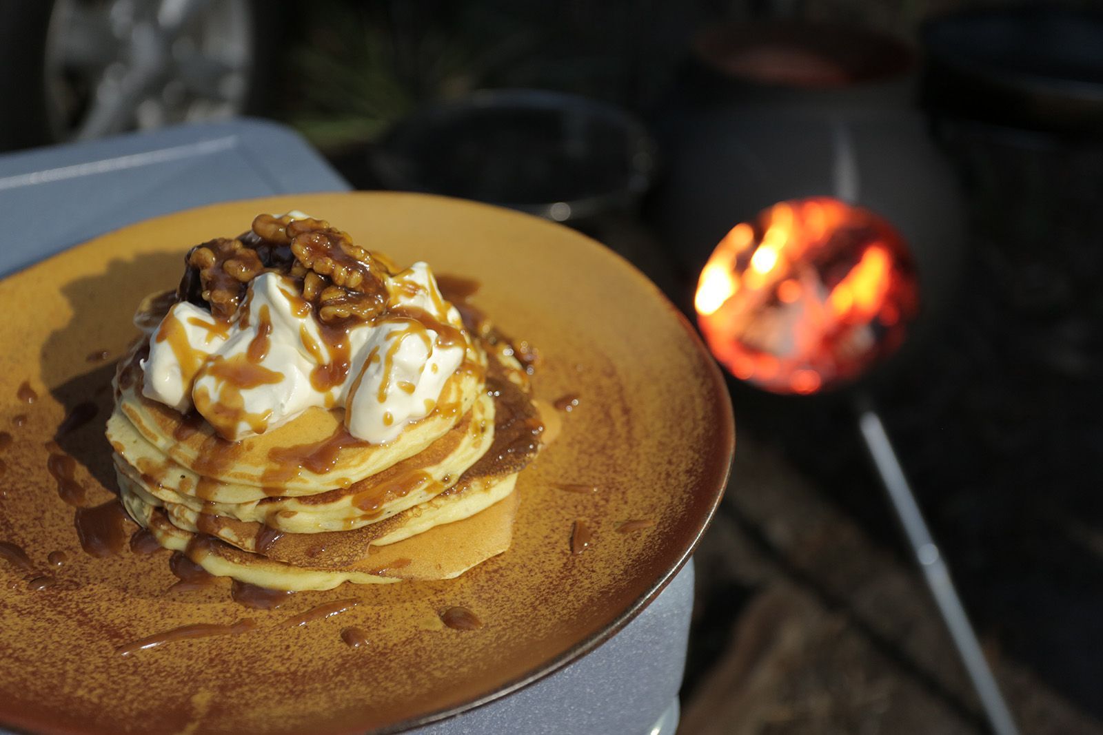 Step 2: Add all of the ingredients for the pancakes to a bowl and whisk thoroughly. The mixture should resemble the consistency of thickened cream – add a little milk if it’s too thick. Heat a large frying pan on top of the Oz Pig. Add enough batter to make a pancake. Flip the pancake when bubbles appear. Continue making pancakes until the batter is all cooked.