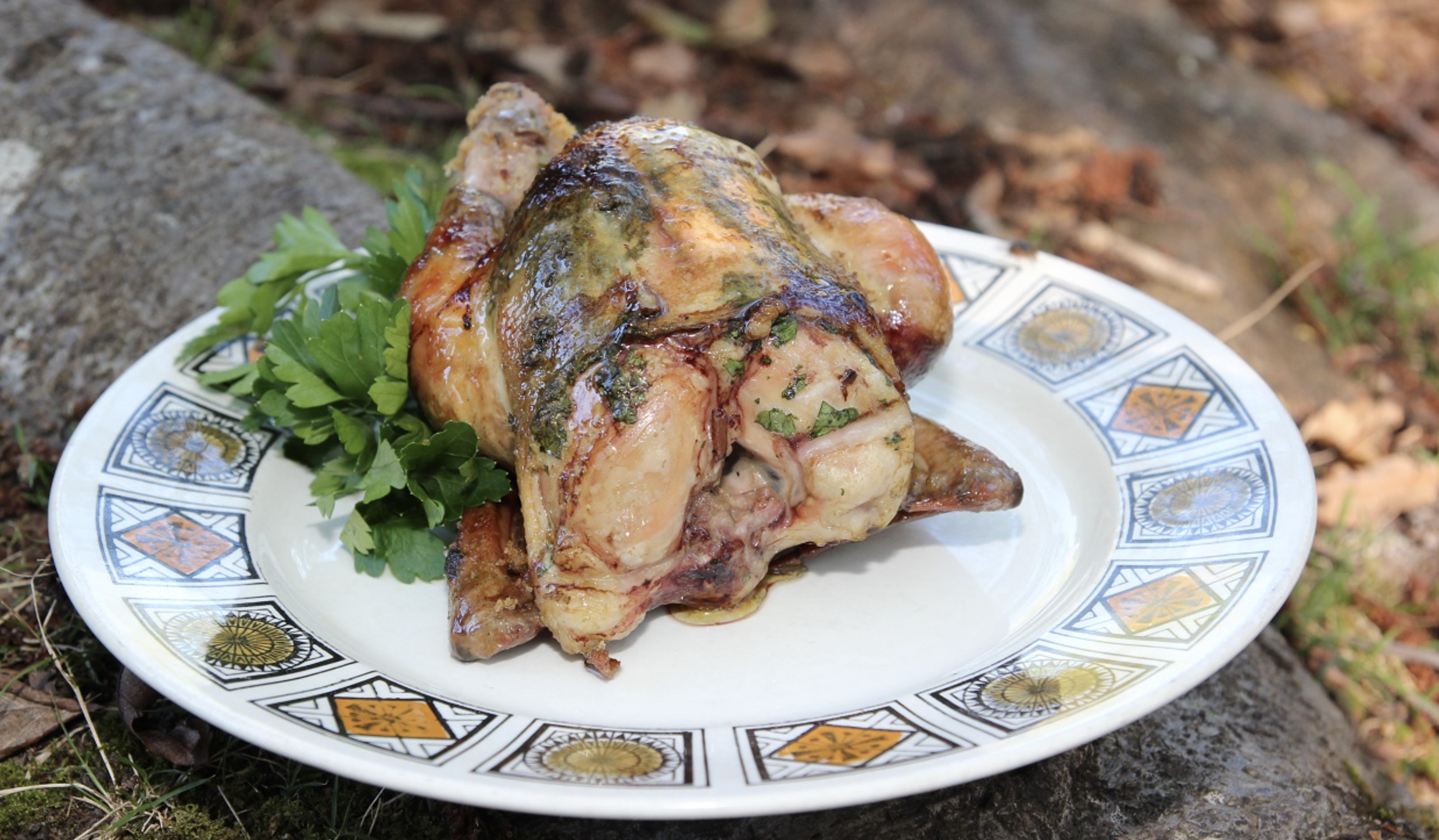 GARLIC BUTTER 150g Butter 5 x Cloves of finely diced garlic 1 x Handful of finely chopped parsley Salt & Pepper 2 x Small chickens or 1 x medium chicken Salt & Pepper