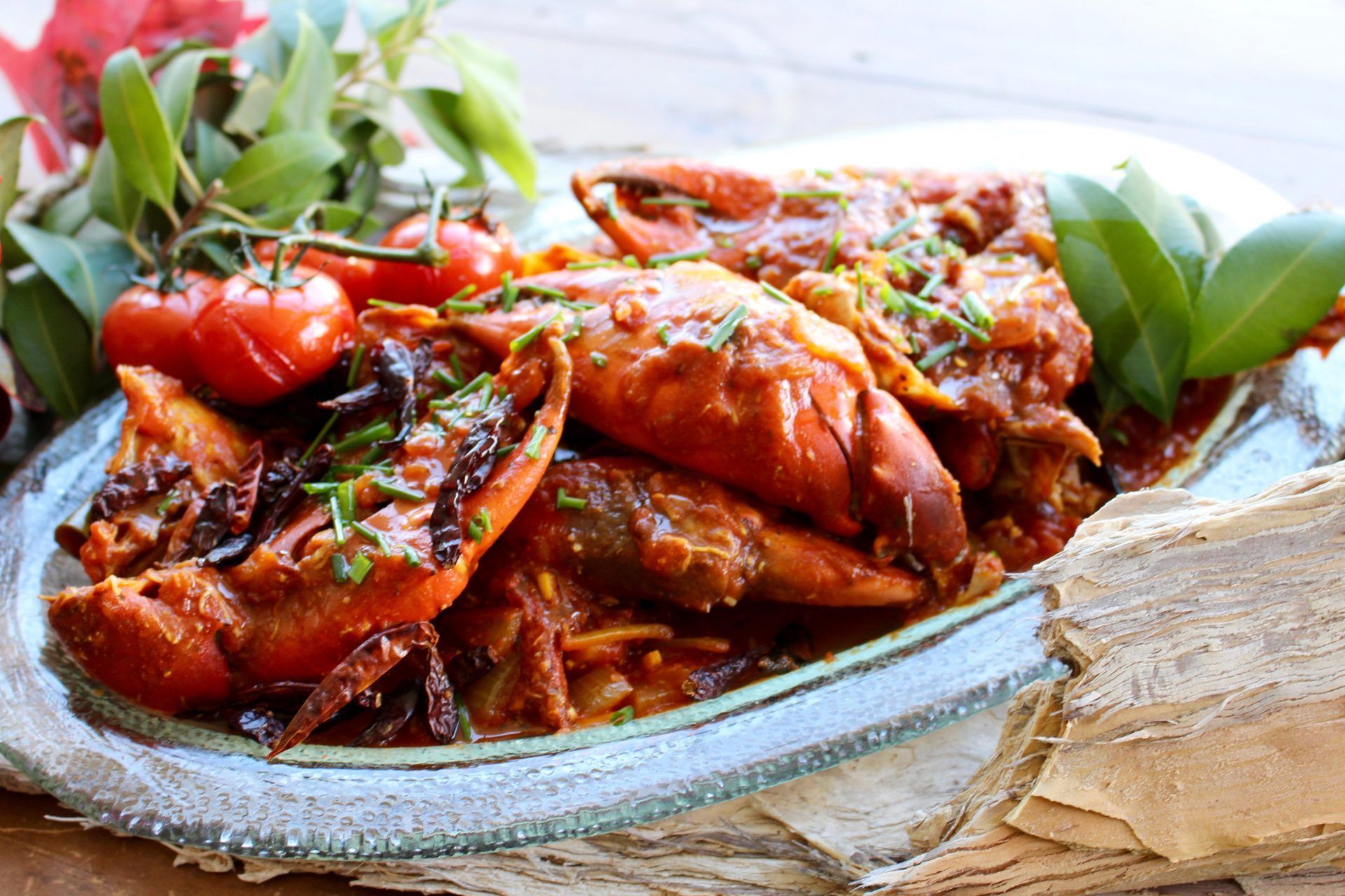 2 whole live mud crabs1 whole onion, diced2 large garlic cloves, minced5 dried whole chillies1/3 cup of peanut oil2 cans of diced tomatoes2 tbsp of palm sugar2 tbsp of curry powder5 lemon myrtle leaves, dried or fresh½ cup vegetable stock