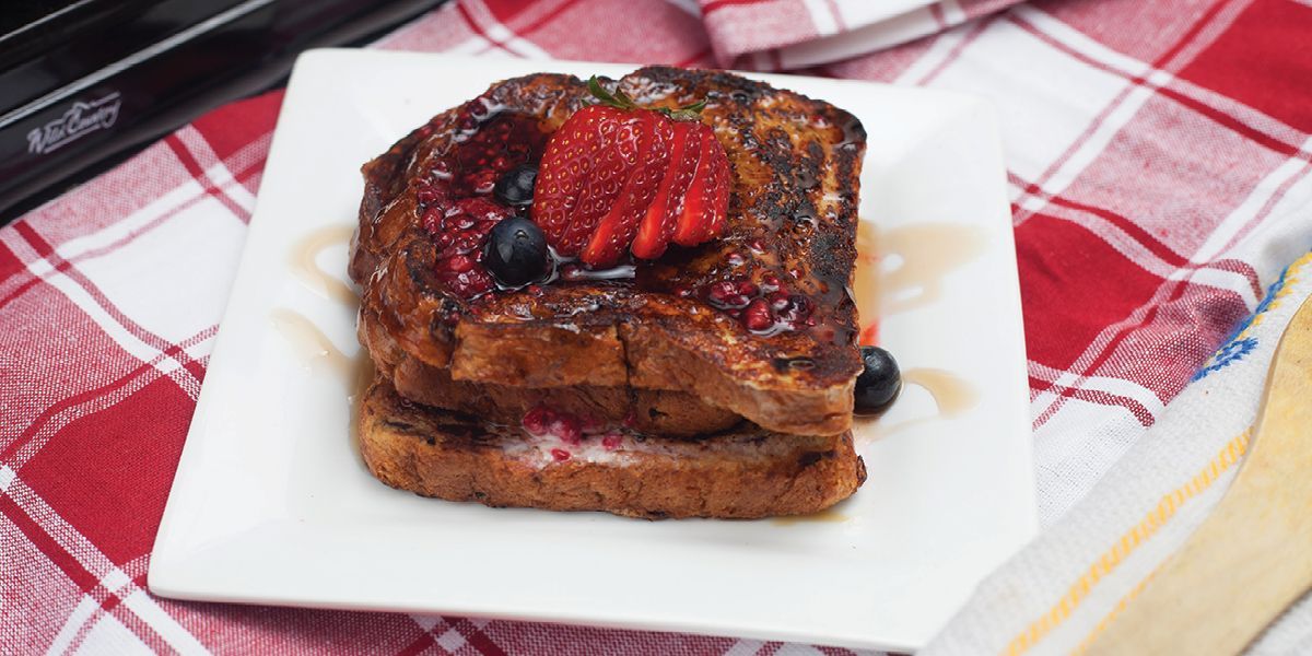 8 thick slices tank loaf bread or fruit loaf1 large egg1 ½ cups mascarpone cheese, cold2 ½ cups strawberries, blackberries or raspberries2 tablespoons strawberry, blackberry or raspberry jam2 tablespoons butter½ cup milk¼ cup sugar2 teaspoons cinnamon1 ½ teaspoons vanilla ¼ cup maple or golden syrup or molassesButterCooked bacon rashers to serve