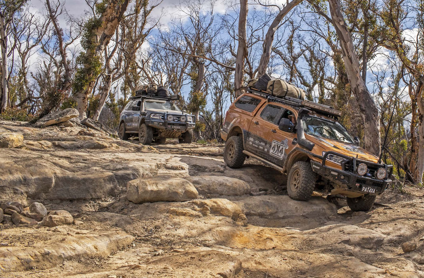 On entering the valley floor, you criss-cross a small creek a few times. The forest here has been scorched by the 2020 fires, and the result is a much clearer view of the surrounding escarpment. It’s quite a short but stunning drive before you’re presented with a few big wombat holes on your outbound ascent. It’s a great opportunity for a photo-opp, as your vehicle will almost undoubtedly pop a wheel or two on the way through. With the lockers engaged and traction control ticking into gear, our vehicles kept their forward motion easily.