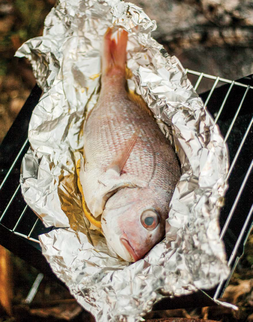 1. Lay your fish on a firm surface and cut three diagonal slashes into the thickest part. Do both sides. 2. Melt the butter in a pan. 3. Sprinkle some garlic salt and lemon pepper on the inside cavity, then brush both sides with a little melted butter (and sprinkle the salt and pepper on the outside as well). 4. Fry the shallots and chopped mushrooms in the rest of the butter until soft; then stir in the parsley. 5. Slice half the lemon, and lay three slices inside the cavity; then fill with the mushroom mix. Secure with a skewer to close. 6. Lightly grease a large piece of heavy foil with butter or oil and lay the fish in the centre. Squeeze over the juice from the remaining lemon half. 7. Bring up the sides of the foil loosely around the fish, then scrunch along the top to seal it. 8. Place the fish parcel/s on a rack over medium coals or a barbecue, and cook until the fish flakes easily on the thickest part – around 20 minutes per kilogram is a good guide.