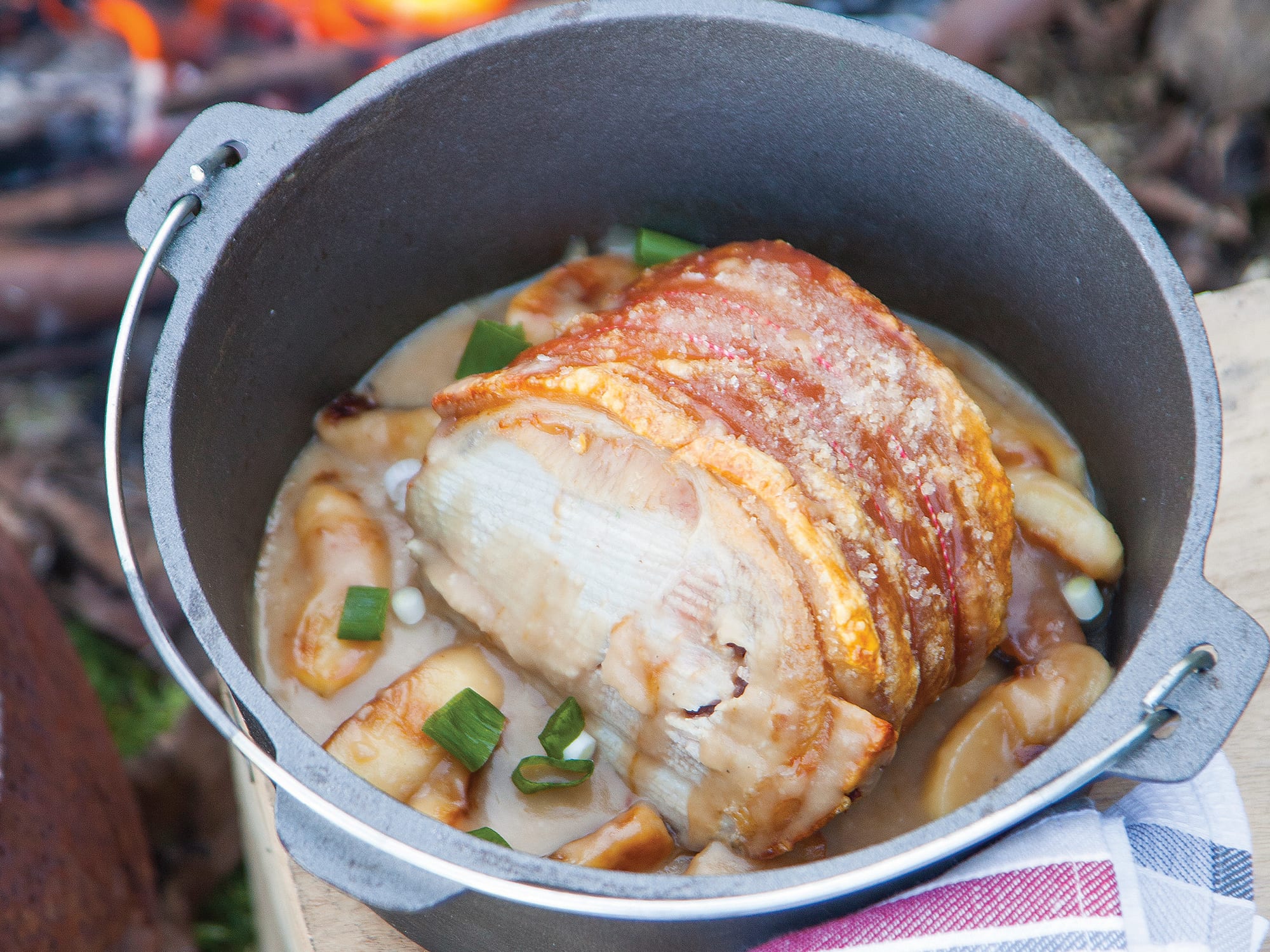 - Place the pork, skin side up, on the trivet in your camp oven and roast at high heat for 20 minutes. Reduce the coal load to a medium heat, then roast for a final 30 minutes.