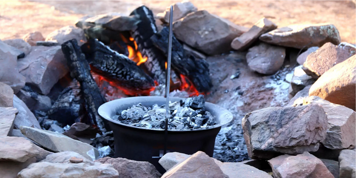 - For best results, place some coals into a pre-dug hole and then place camp oven into the hole. Place some coals around the sides and on top of your camp oven. You may need to rotate every five minutes. Remember you only need to warm this up, so no need to create the “flaming fire of death”.
