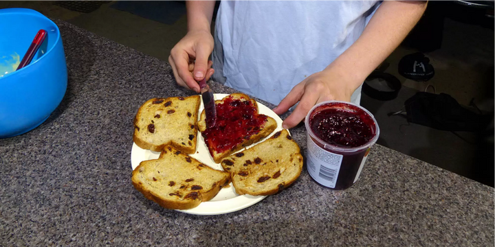 - Spread bread generously with jam.