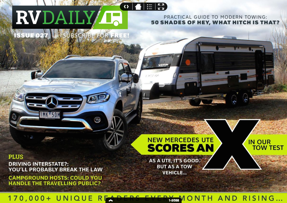The X-Class has landed so the team at RV Daily have given it a tow test; an über ute it ain’t. Plus, what does it take to be a campground host? Why Australia’s driving laws need to be the same, and get up to speed on all the gear that connects your vehicle to your trailer. If you want to see what else the team at RV Daily have packed in, click the link and have a read for FREE! https://rvdaily.com.au/rvd/issue027/#1