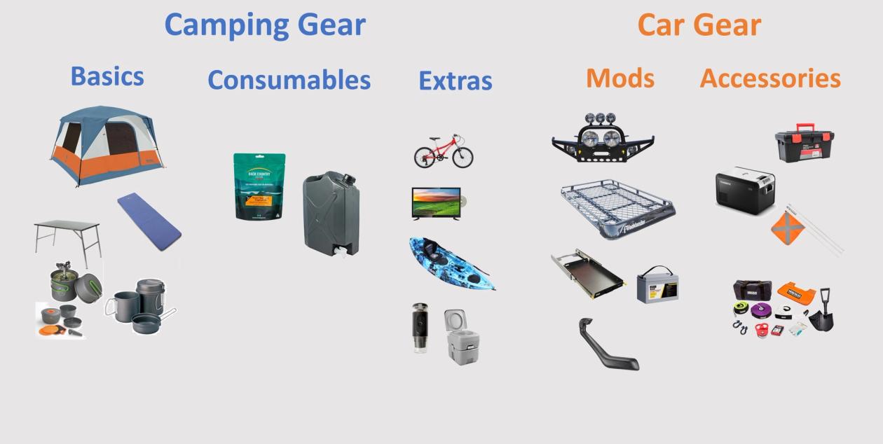 Everyone covers the basics so they can eat and sleep, and we all take a varying degree of extras specific to our interests; bikes, metal detectors, kayaks and yes I’ve put a toilet in there! Consumables are food and water, and then there’s the car gear; Modifications are permanent changes to the car, accessories are things you take with you.